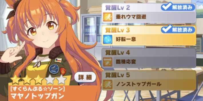 回复类就能推荐使用,直道上持久力回复、在拐弯时通过倾斜回复持久力、比赛中盘持久力回复【作战·前列】。