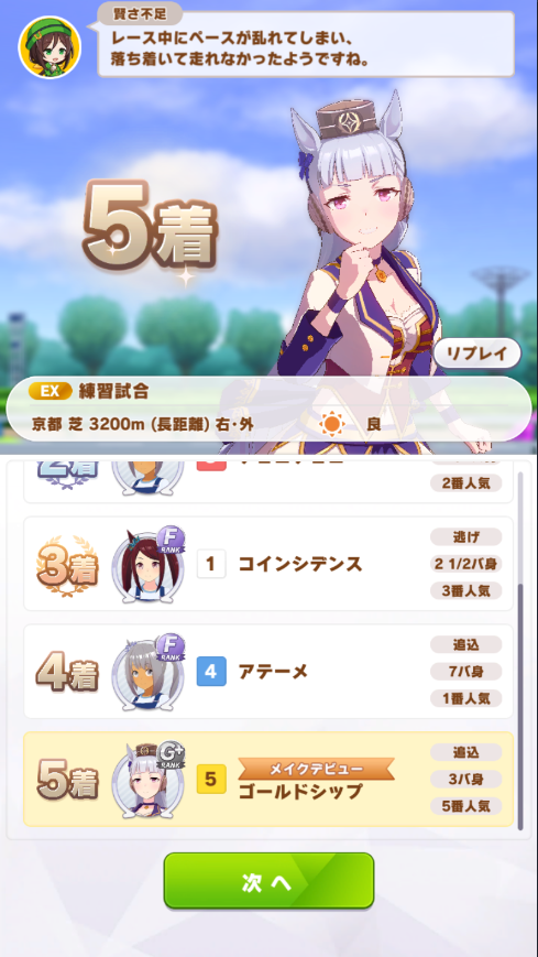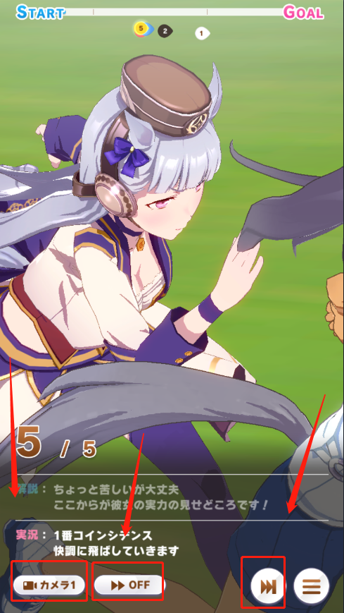 (2)普通比赛:一般来说普通比赛玩家都是可以自行操控是否跳过的,在进入比赛后会进入到操作界面。左侧的“カメラ”代表视角,点击可以切换摄像机机位。中间的“OFF”代表着比赛速度,点击后最多可以四倍加速。最右侧靠左的一个按钮是跳过当前阶段比赛,多次点击可以直接跳过所有的比赛过程。