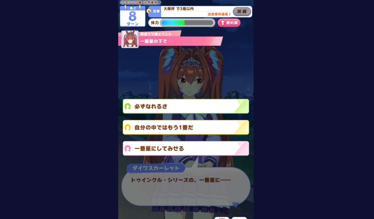 2021年05月17日 14:11 来源:九离赛马娘是一款非常好玩的养成抽卡类手游,在游戏中我们可以培养自己的马匹去进行跑马比赛。那么 赛马娘大和绯红怎么练呢?大和绯红是前期系统送的五匹马之一,很多新手小伙伴想拿来练练手,下面就让小编来告诉大家大和绯红的育成攻略吧。