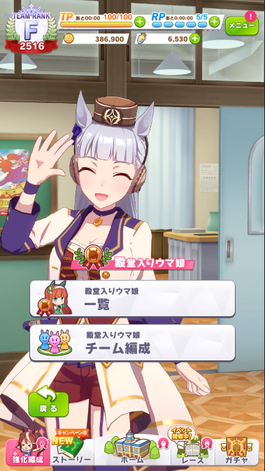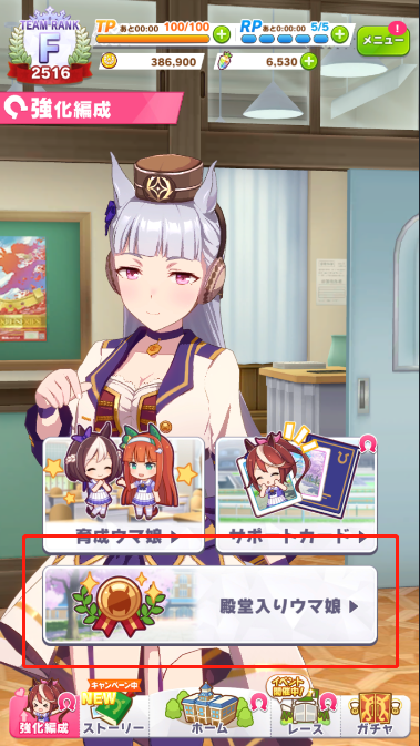 (2)插件殿堂:依然还是进入到游戏中的主页面位置,这次点击左下角位置的“強化編成”,然后选择下边的“殿堂入りウマ娘”,这样就可以查看已经育成的马娘了。
