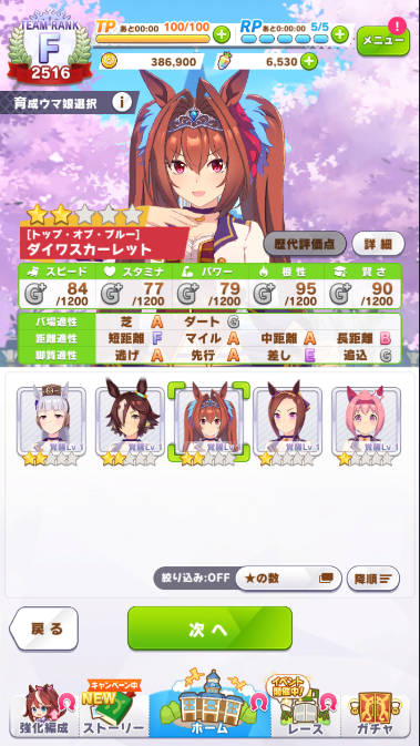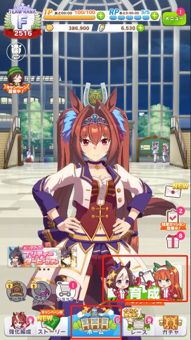 (1)育成步骤:首先进入到游戏中的主页面位置,点击中间的“ホーム”后选择并点击下面的“育成”进入角色选择界面。首先选择一个主马娘(育成后的马娘),然后选择两个种马,也可以使用好的,最后选择需要装备的支援卡,这样就能进行育成了。