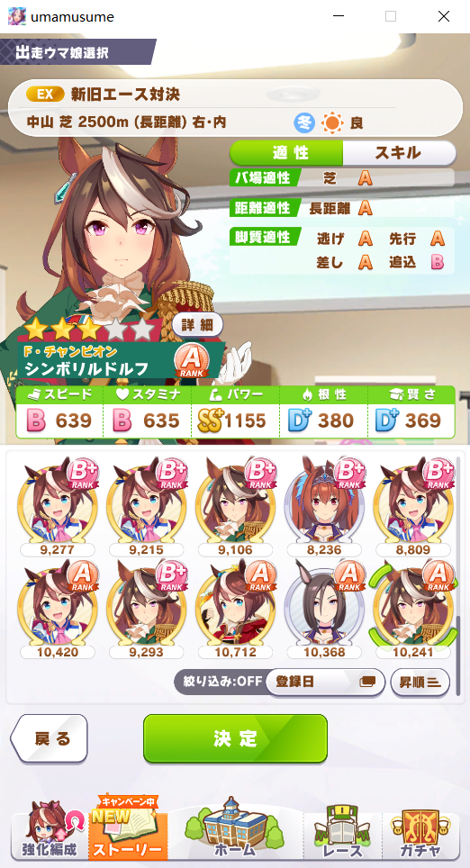 首先是第一章剧情,第一章剧情中有两个比赛任务,第一个比赛任务非常简单,与大家同台竞技的都是C级别的马娘,没有任何压力。而第二场比赛就稍微困难一些,比赛场地为长距离草地,因此推荐大家选择长距离适应性为A以上的马娘参赛,并且最好有一个以上的金蓝回复技能,避免因为耐力不够导致比赛失败。