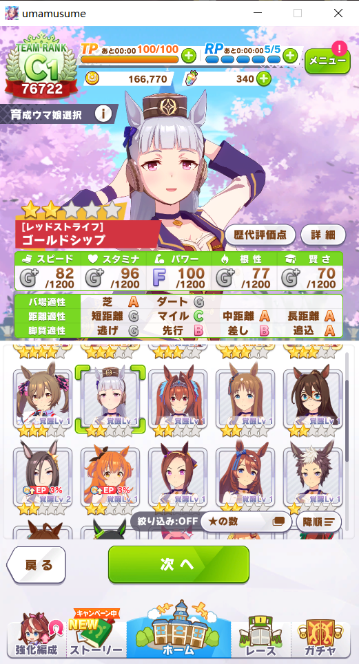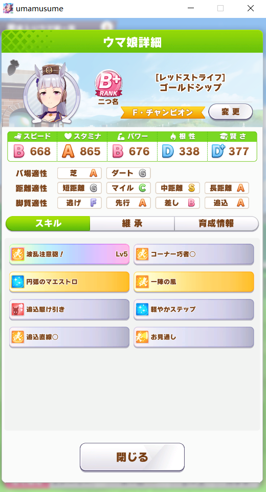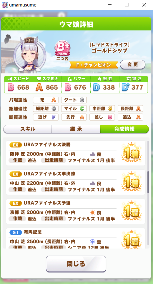 总的而言,把握好训练节奏,尽量提升速度,耐力力量三个属性并多多参加G1,G2赛事就可以稳定获得“破天荒”称号了,并且黄金船自身的评级还能稳定在B+以上,一举两得。