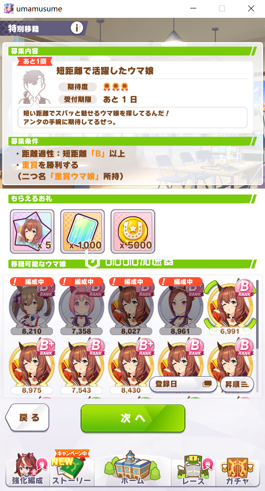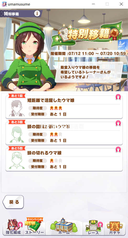 特别转会功能的作用主要有两个,一是获取奖励用于培养新的马娘角色,二是清理掉殿堂中没有用的马娘,相当于清理仓库。而根据小编的实际测试来看,特别转会的招募条件还是比较严苛的,基本上只有B评级以上的马娘角色才有可能完成这些条件。
