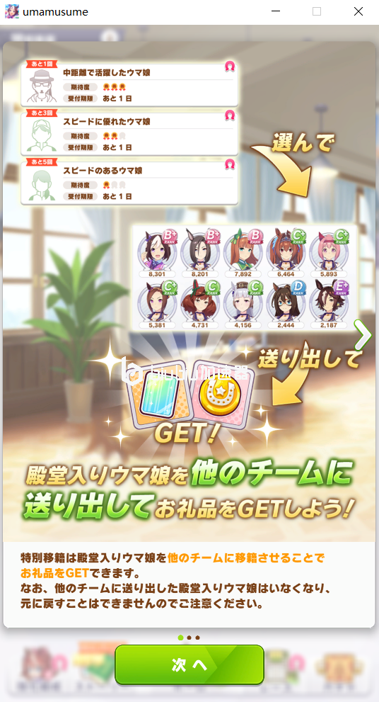 因此大家在实际使用这个功能的时候也千万要注意,不要错误地将自己主力马娘进行转会。而对于刚开始玩的萌新小伙伴而言也可以暂时选择放弃该功能,奖励虽然不少但是也并不非常重要,没有必要为了转会而强行培育马娘,影响自己的游戏体验。
