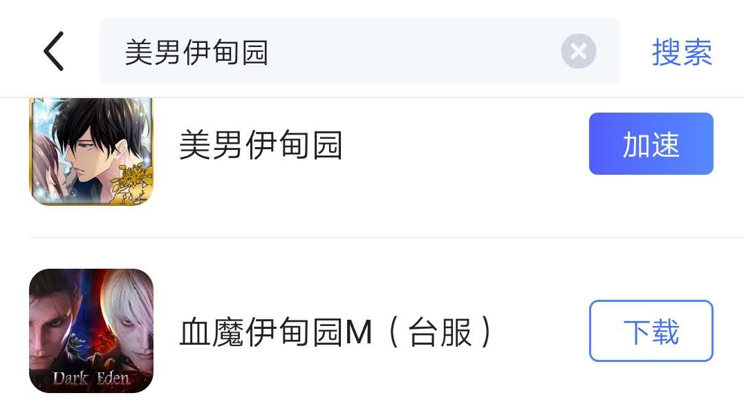 (1)下载游戏:玩家需要提前下载安装好加速器,然后在输入框位置输入“美男伊甸园”就能找到游戏的安装包。
