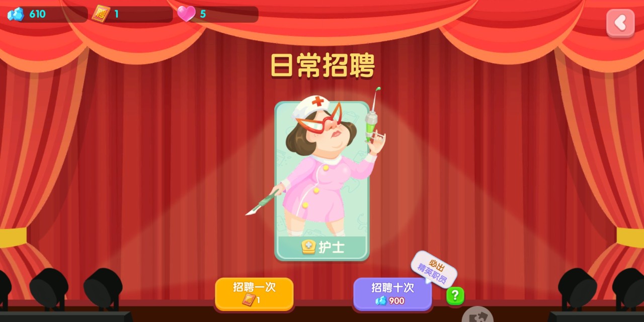 在建造科室完成之后,要为科室安排一个职员才能进行工作。职员可以从招募获得,招募的条件会有一次免费的,是需要一定时间冷却的,还可以通过做任务来获得招募卡,或是直接花费900钻石来直接招募。(招募了之后别忘了给职员们培养升级哦,这样可以提升医术值哦!)