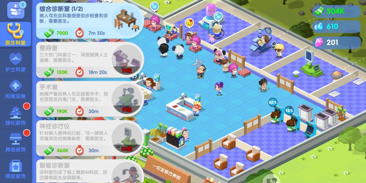科室一共有护士和医生两种,刚进入游戏的时候,因为等级原因只能建立一个,玩家会获得系统给的初始基金,进行科室建造。(注意这里的科室建造,是接待病人赚取金币的主要地方哦。)