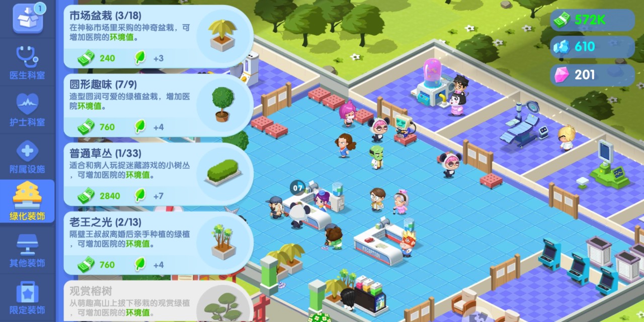 当玩家已经完成了小编以上所述,就可以点击地编,然后按照喜好来摆放啦,还可以为医院建造一些绿化来提升环境值。(在这里建造饮料机可以增加额外收入哦。)