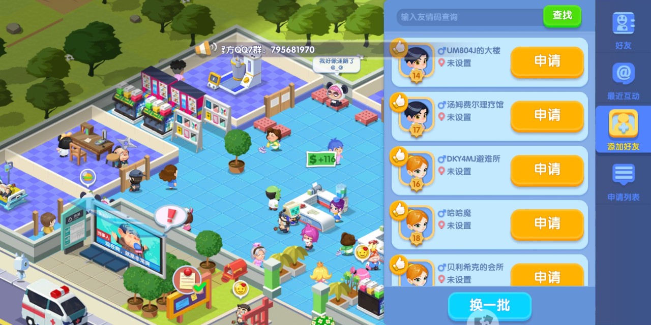 申请添加好友在主页的右下角,加好友之后,还可以和好友互相点赞,提升医院的人气值,并且在访问中,可以从好友的摆放中获取灵感。