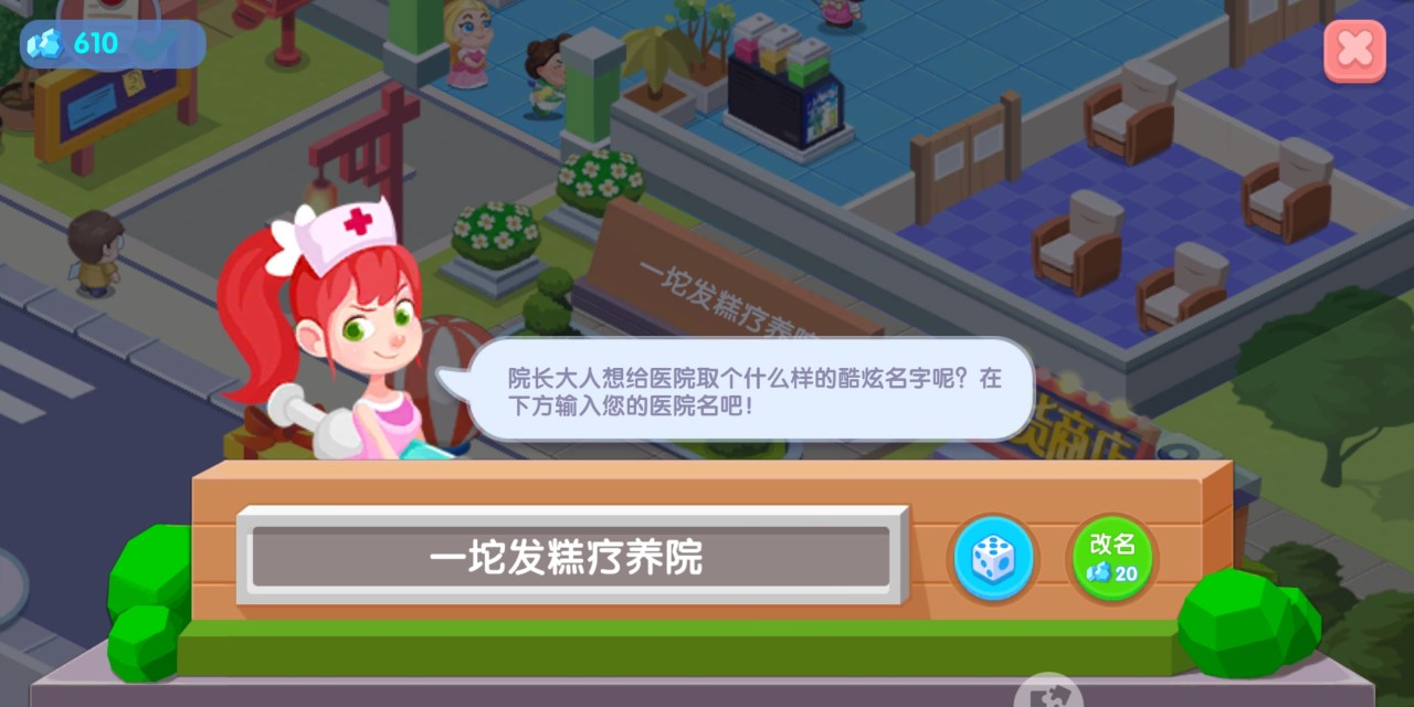 在进入游戏后,先为医院取个名字吧,这个是玩家来决定的,第一次免费,取名之后想要再更改就需要花费20钻石了哦。