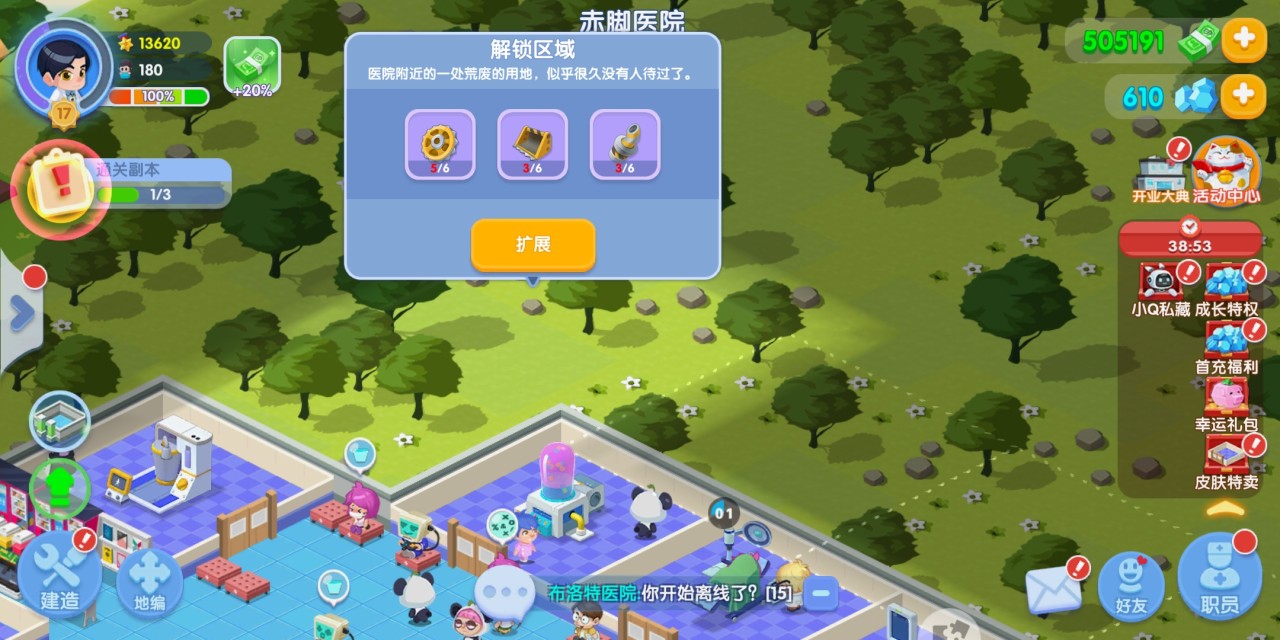 萌趣医院是一款经营策略类型的游戏,所以需要扩展地盘去达到壮大医院规模的目的。扩展新区域需要用到一些物质,这些物质可以从杂货铺和每日任务中获取。(解锁新区域是需要达到一定的等级作为首要条件的,所需物质为次要条件。)