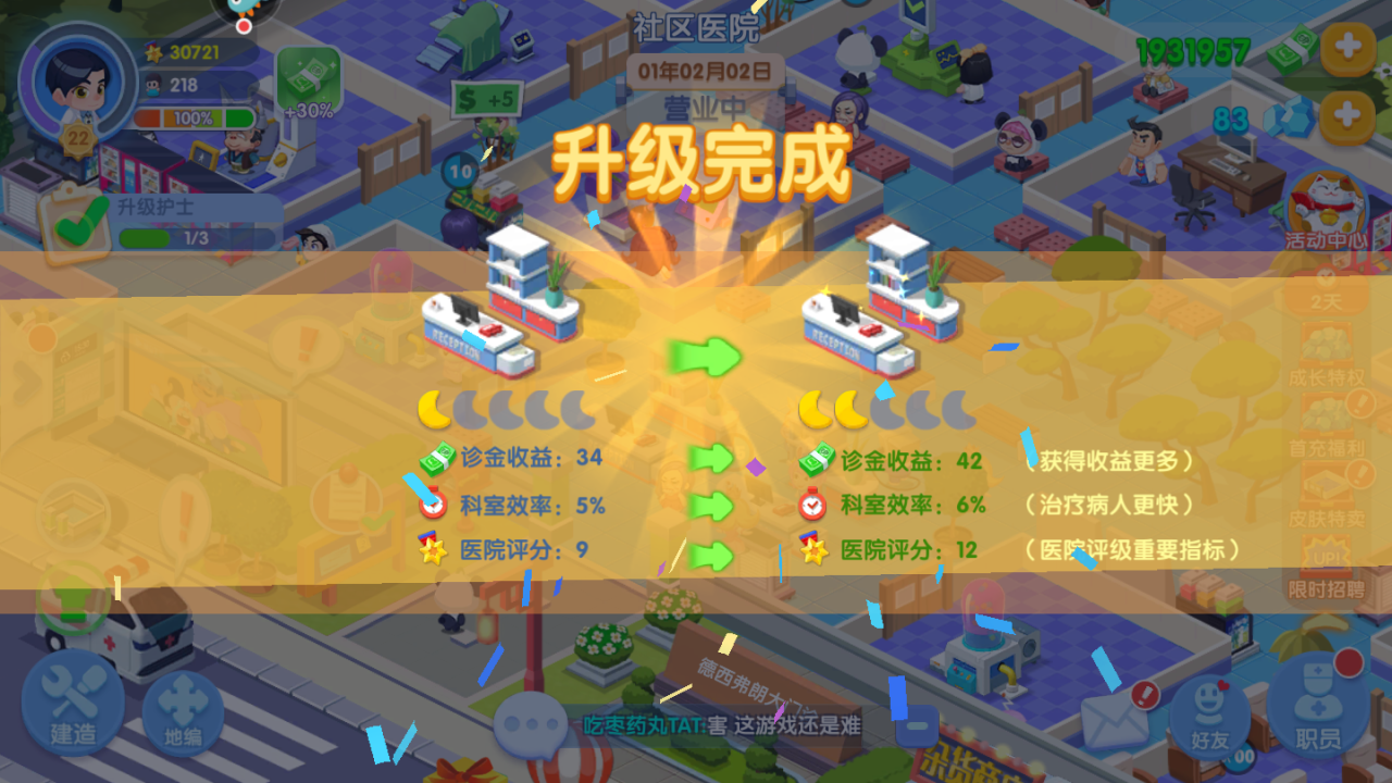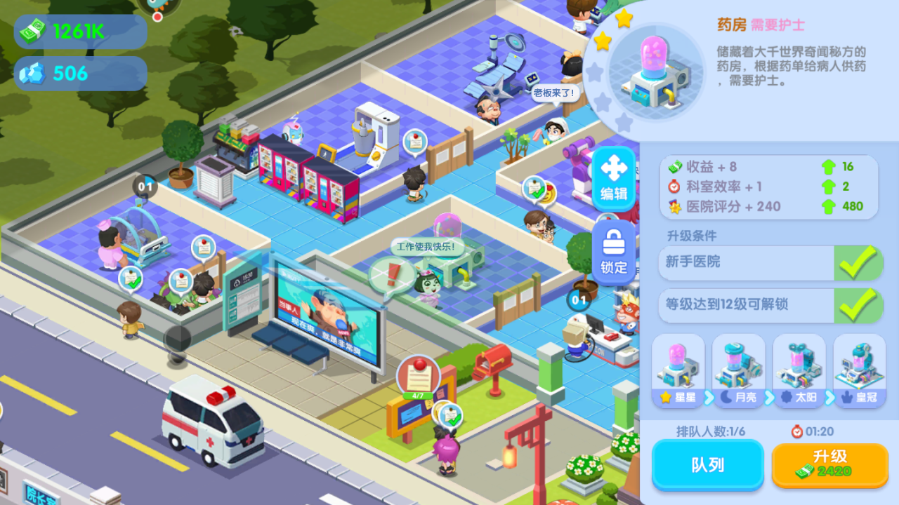 诊室的不同升级所需要的条件和消耗也有所不同,最主要的前置条件就是医院等级的提升。所以设施的提升和医院的进步一直是相关联的。诊室的升级可得到更多的收益、科室效率提升治疗病人速度更快、治愈度有所提升,同时会提升医院的评分,医院评分是医院评级的重要指标。