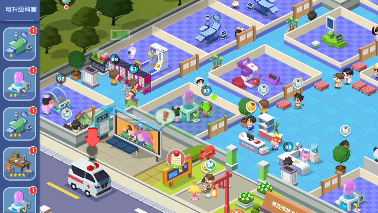 在初步完成医院的基础建设和员工的招聘上岗后,我们就要开始对设施进行进一步的升级了。毕竟想要提升医院的治愈程度以及名气,和医院的建设程度是分不开的。玩家的科室达到可升级的条件后在左下角会有对应的系统提示,玩家点击升级箭头后即可查看到可升级科室的列表。