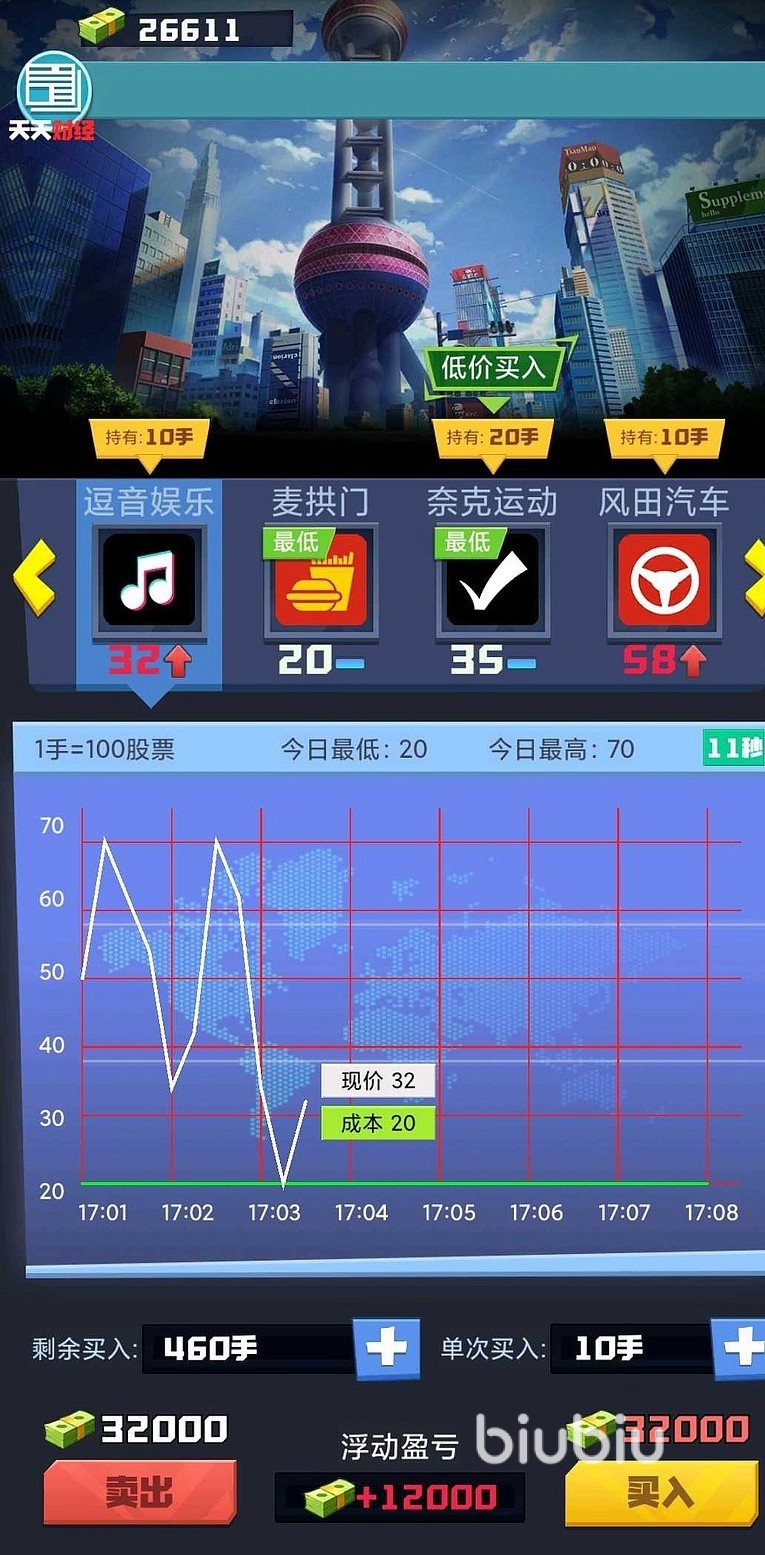 游戏初始只有4只股票,等玩家升到15级,每升5级则开放两只股票,总共有16只股票。玩家要在低价时买入,高价时卖出,赚取差价。玩家前期可以用少量钱来频繁交易,多次赚取差价,就加快前期的赚钱效率。每只股票的最低价和最高价都是固定的,玩家可以稍微留意一下。