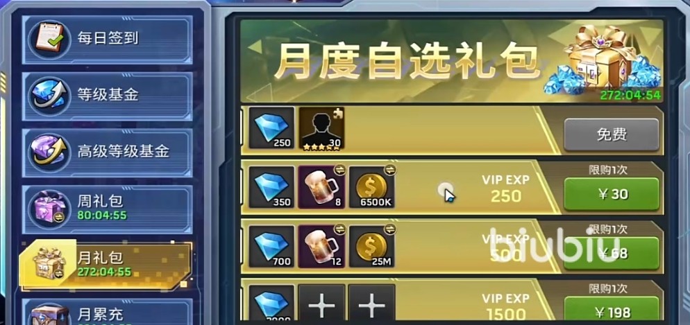 游戏中最为值得玩家们选择的就是月度礼包了,不过游戏中在月卡上给了玩家很多的选择,其中免费的礼包是自选的,建议必选啤酒,30元一档的可以考虑。充值月卡同样也计算进累计充值礼包中。
