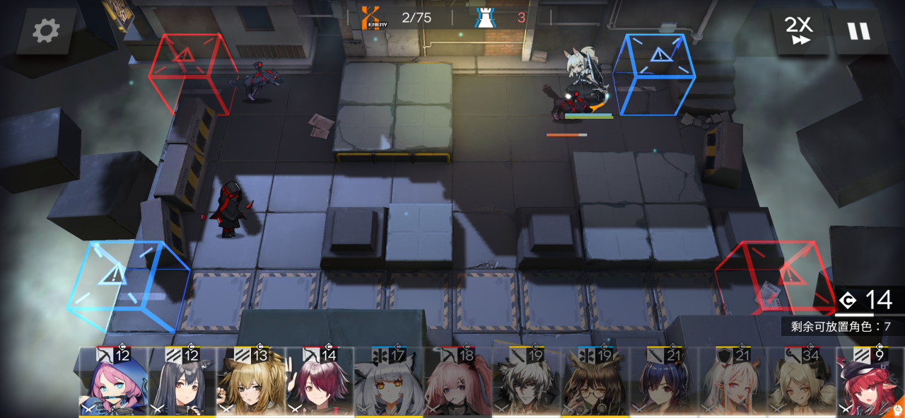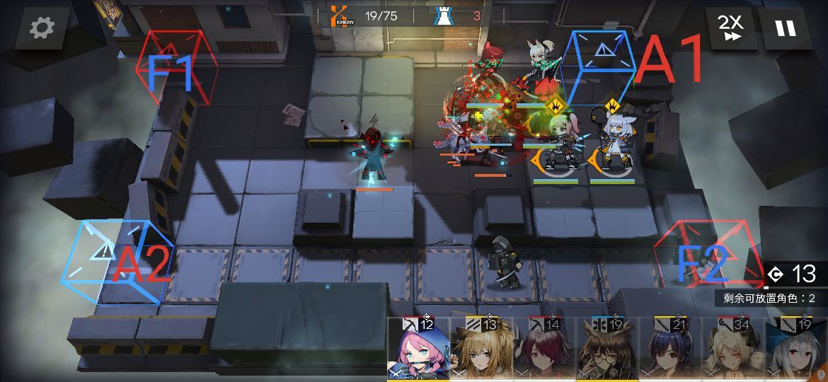 但这其实是一个陷阱,从F2进入的敌人的目标全都是A1,高阶术师虽然会在A2转一圈,但并不会进入。真正的核心阵地应该围绕左上方高地的四个单位和A2前的低地单位展开。