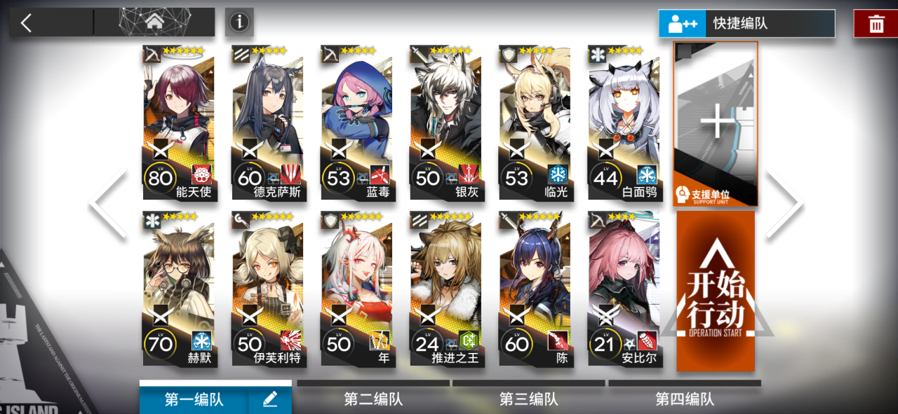 我方需要大量的狙击干员来消灭术师组长,同时也需要至少两个重装干员来互助大门,由于阵地有两个部分,自然也需要两个医疗干员,所以我队伍配置如下,百分之八十的干员至少是精一,可按照职业特性进行替换: