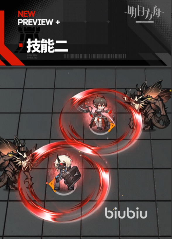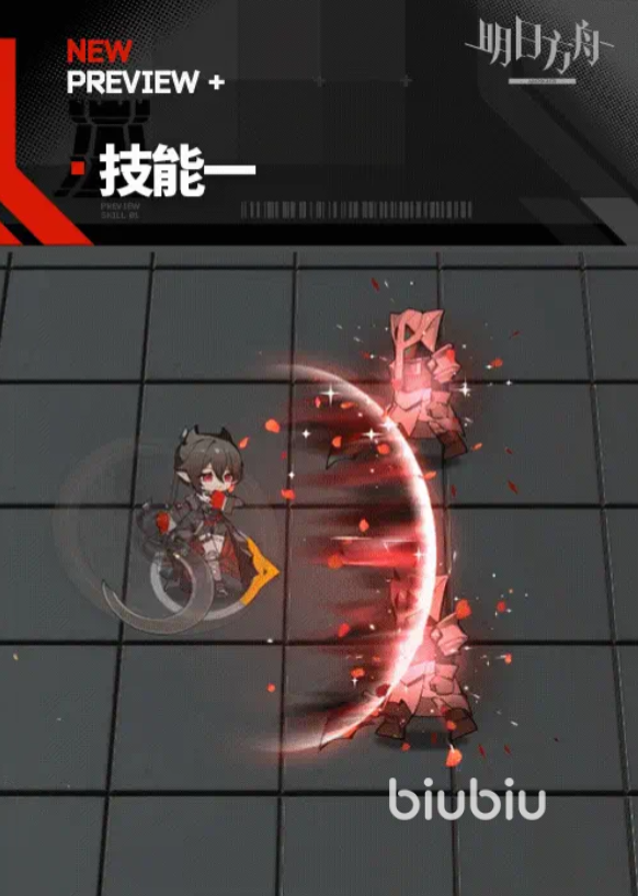 1技能“玫影觅迹”,她在下次攻击时的攻击力得到提升,并连续攻击两次。2技能“绯红壁合”,技能开启后,她会停止攻击,同时在自身以及其他一名队友的地面单位处召唤血镰,对周围所有敌人进行切割,每隔一段时间造成一定物理伤害。