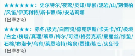 也就是说只要出6星就必定是大家自选好的,在此卡池中6星可选角色会有锏、左乐、涤火杰西卡、妮芙和焰影苇草,5星可选角色会有夜半、洛洛、波卜、温米、和弦和深律。