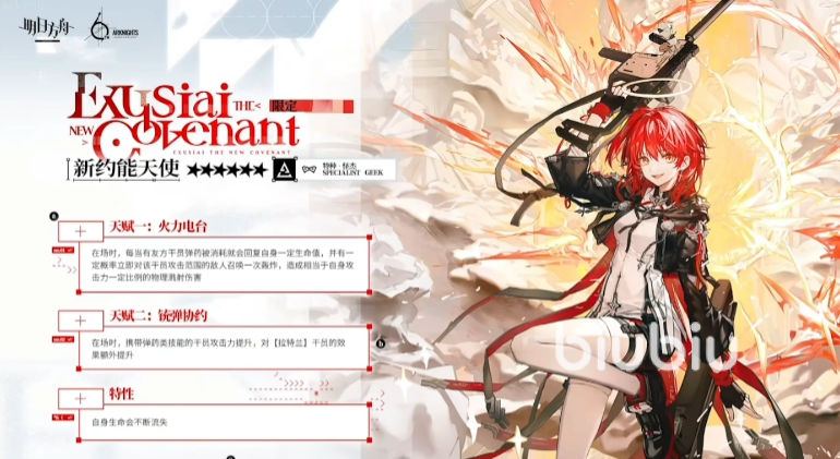 首先就是新约能天使这个全新的六星角色,这是全新的六星限定干员,她的职业是怪杰,该角色的获取方式比较特别,是作为赠送的干员,但是需要大家抽满300抽,就能获得这个限定的六星了,能力方面也是比较出众的,能恢复生命值,可群攻,还能造成溅射伤害,总之异常的强大。