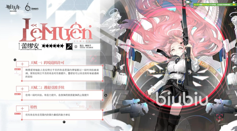 蕾缪安是全新的6星狙击神射手,这个新角色的技能机制其实是比较复杂的,比如她的天赋,精英或者领袖的敌人在拉特兰干员攻击范围内停留,超过一段时间后会被通缉,受到拉特兰干员攻击时的伤害会提升,而她能攻击所有被通缉的敌人,天赋效果相当的出色。