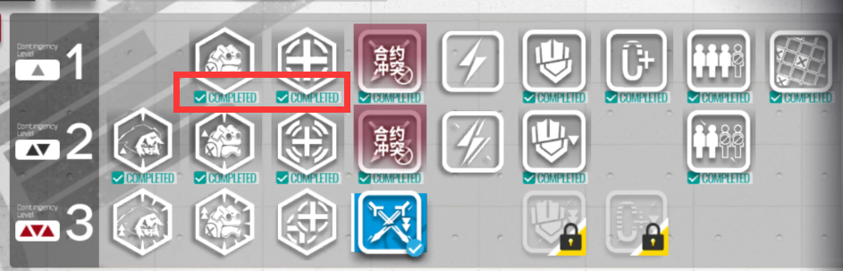 「行动协议」常驻图统共会给2个(具体是通过关卡合约难度4和8),日替图每一天的活动都能再获得2个(同样是通过关卡合约难度4和8)。估计各位只需每一天打日替,「行动协议」一定是够的。这儿首要的难点是首先前提:做完合约数22。必须留意的是:这不会是让我们通过关卡危险级别22的图,只是要试验过22种不一样的合约。下列的每种全都是1个合约,佩戴并通过关卡过的会在正下方打“√”,写着“COMLPETED”。