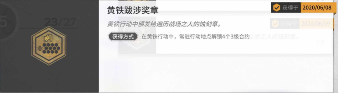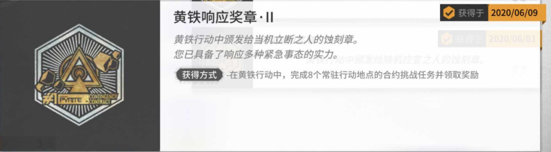 在当前的版本中(06.15危机合约“黄铁行动”),蚀刻章主要分为两种:「履历奖章」与「活动奖章」。「履历奖章」是根据大家的游戏进度获得的(公开招募、干员数量等),可以理解为“常驻奖章”,不会绝版、可以随着游戏过程慢慢获得。