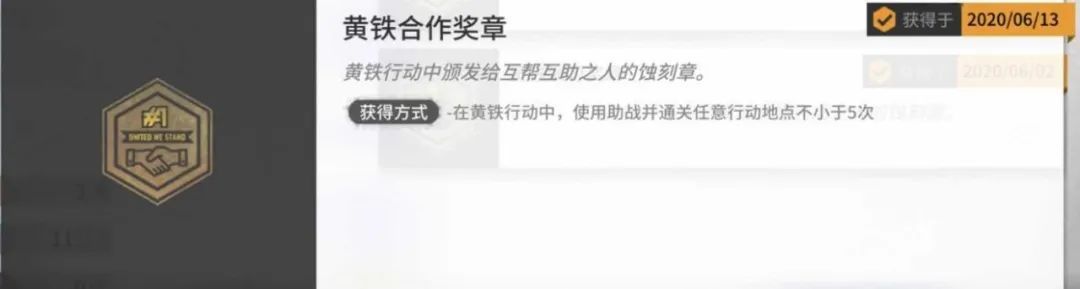 “在黄铁行动中,运用助战并通过关卡随意行动地址不小于五次。”