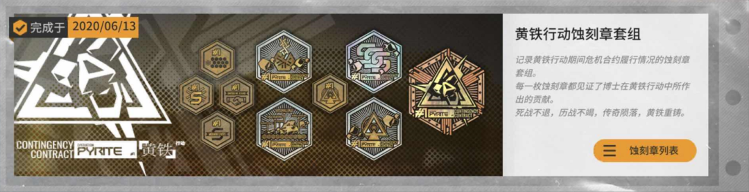 「活动奖章」是跟着游戏活动对外开放的,当今的危机合约“黄铁赛季”恰是初次如此的活动。能够认为为“限制奖章”,会绝版,危机合约每一个赛季的蚀刻章不会开展复制。现在只对外开放了黄铁步伐的蚀刻章,共十枚,如图所示: