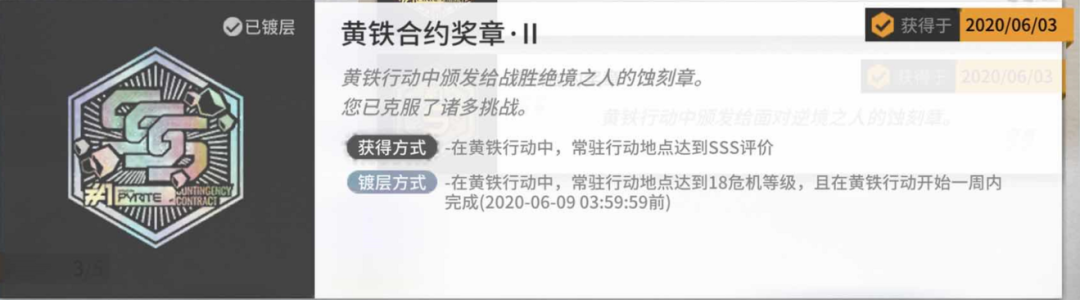 现在这一个奖章的涂层已绝版。2020-06-09 03:59:59之后的全部合约奖章,都没法开展涂层了。目前能获取的仅有上图左边的黄铁合约奖章·II。错过了的博士,在到时候合约对外开放时候记住及早。