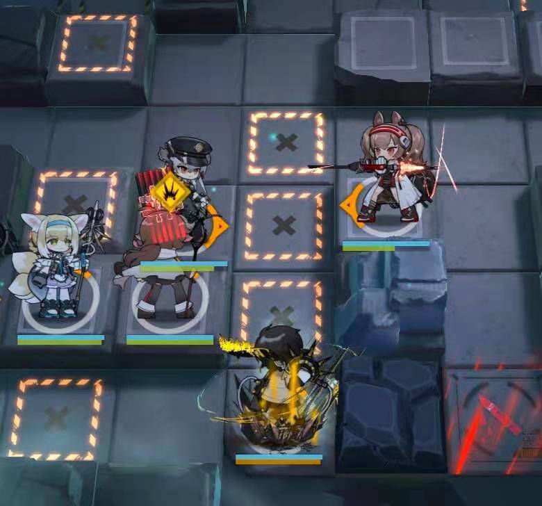这时左上方首先石块人会来到铃兰上边两格的地方,恰好处在狐火,钙质化及火山的三重攻击范围内,3个技能与此同时启动,但单靠火山不足以一击必杀它,还要在安洁莉娜上边一格放史尔特尔补伤害,与此同时解决掉从右下方回来的第2个践行者。