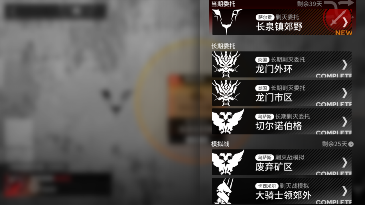 剿灭模式中只有常驻委托和当期委托是有合成玉奖励的,而限时委托(模拟战)只有在首通时才会有奖励,之后反复刷取是不会有额外奖励的。从下图我们可以看到,在当前版本中的当期委托是长泉镇郊野,而常驻委托是切尔诺伯格,龙门市区和龙门外环。通过点击剿灭模式主界面的地图就可以选择对应的剿灭委托进行正式的关卡攻略了。
