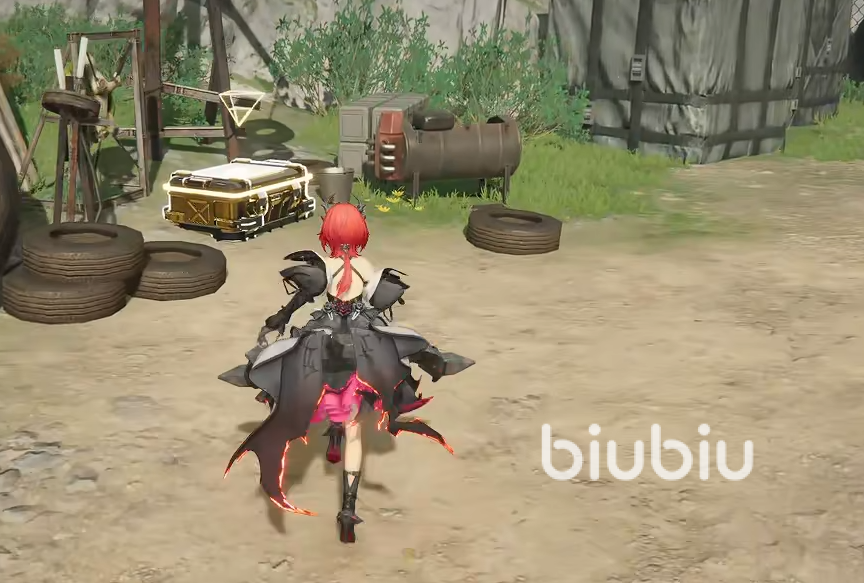 接着回到铁网门前,这里现在因为通电了,所以门口的机关按钮可以使用了。互动后铁门会打开。咱们先往着左边的集装箱移动,可以看到一个醚质,我们将其获取。接着往东南方向楼梯那边前进,在楼梯这里我们可以看到一个采集点。接着我们往西南方向移动,然后下楼梯,在左手边可以看到一些轮胎,在轮胎这里有一个宝箱,我们将其给打开。在我们的右手边会有怪,这里建议直接将怪给清掉。