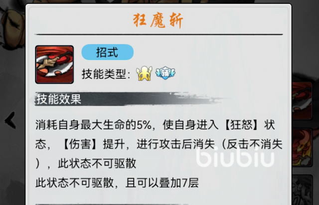 一技能为狂魔斩,主要依靠自身生命值而不断的进行战斗,他可以在消耗自身生命值5%的情况下使自身陷入狂怒状态,可以不断的提升普攻伤害。狂怒状态可以帮助玩家提升10%的攻击属性,物理攻击属性的话也将提升5%,最多可以叠加七层,也就是说可以提升70%的伤害,属于不可驱散技能,只需要使用一点的能量就可以快速的进行使用。