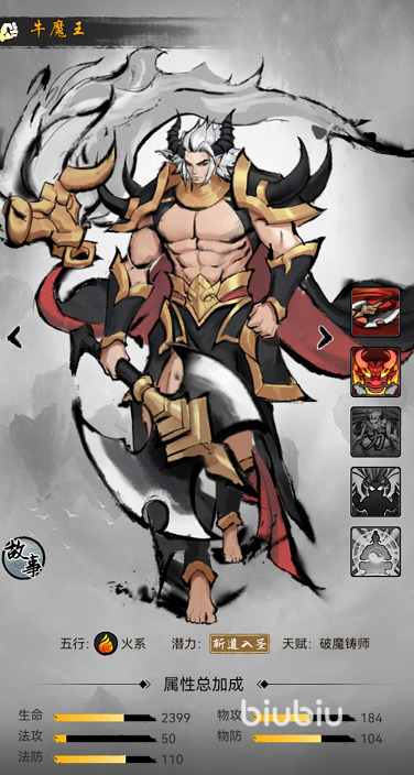 大家对于牛魔王的了解应该都来自于西游记,但是在游戏内与西游记完全不同,牛魔王与孙悟空为结拜兄弟,是一个不可多得的战斗系角色,他是游戏内为数不多的可以依靠自身武力能与孙悟空匹敌的角色,属于佛魔道中的一员,玩家可以通过嫡仙台招募获取牛魔王,外观就是一个非常强壮的样子,这也为玩家带来了很深刻的印象,他一共会有五个技能,前两个技能为主动输出技能,后三个技能为被动技能,会跟着玩家实力的提升而不断解锁。
