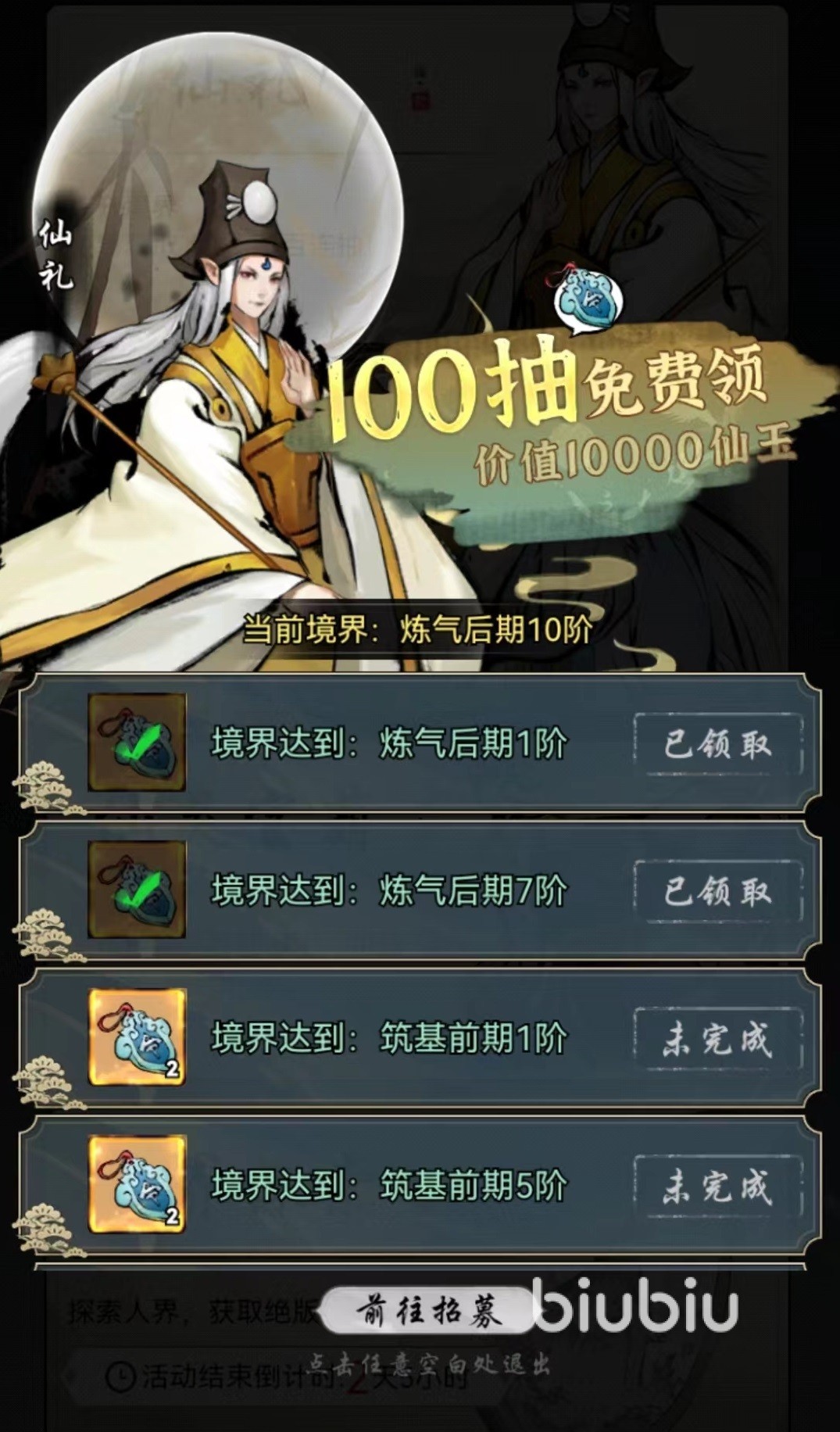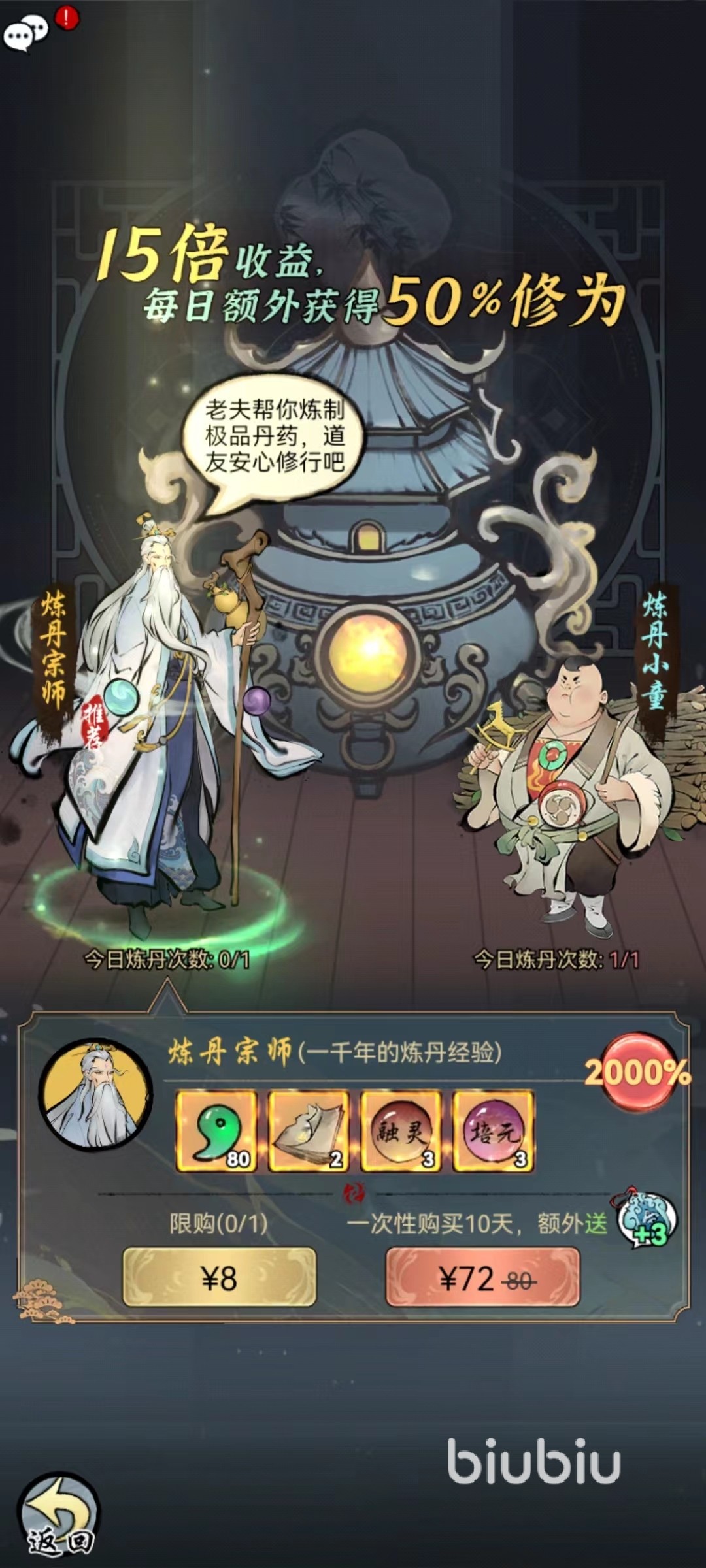第3项是仙礼,只要达到一定的境界就会免费赠送大量招募令,实现最多100连抽,同样为获取仙友奠定了基础。第4项是八卦炉,分为炼丹小童和炼丹宗师两项奖励,炼丹小童免费获得,炼丹宗师需要购买。这两项内容都是为大家额外提供修为,直接赠送了大修为丹快速突破,在前期非常好用。