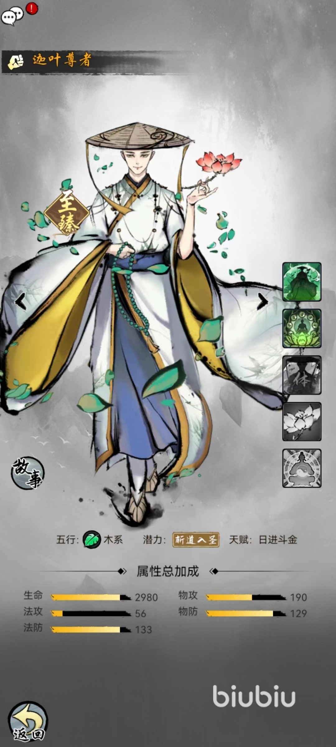 迦叶尊者同样是辅助,但是效果和金灵圣母完全不同,普通招式摩柯迦叶可以对敌方目标造成一次伤害,并且有几率自身获得护盾,护盾可以吸收大量伤害数值和自身生命上限有关,强化了生存能力。神通招式佛修苦行,自身进入到苦行状态,在此状态下如果己方角色收到伤害,则迦叶尊者可以替其承担一大部分,并且在状态结束后将自身承受到的所有伤害按照百分比返还给敌方全体。对于团队保护非常好的仙友,而且还有不俗的伤害。