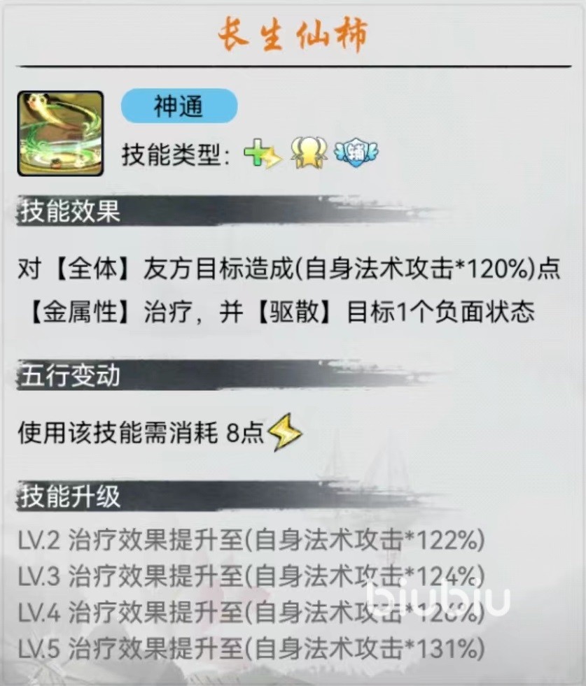 首先这名角色非常特殊,不仅可以在抽取中获得,也是7日登陆所赠送的奖励之一,所以很多玩家在前期都能够直接获得。但是有些玩家不知道她的强度如何,是否值得培养。先来看一下柿子的招式技能清符,能够为己方血量最低的目标恢复生命值,神通招式长生仙柿,为友方全体进行一次高额治疗并且能驱散治疗目标身上的负面状态,属于治疗和驱散相结合的辅助型角色。