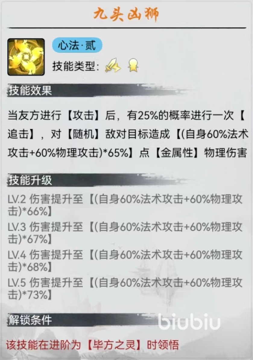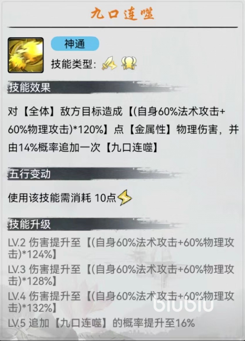 神通招式九口连噬,对敌方全体目标造成一次输出,计算模式和普攻招式相同,并且在使用此技能之后还有几率再追加一次,如果运气够好,连续两个神通将会对敌方带来毁灭性的打击,体压血能力非常强悍。虽然技能消耗的能量多一些,但是可以通过其他途径弥补。当技能升到顶级时追加几率甚至可以达到20%,已经是非常可观的效果。在心法血口吞天加持下,自身暴击提升,另一个心法九头凶狮,在友方其他单位输出之后,九灵元圣有机会附加一次追击效果,伤害目标随机选择。很多时候往往整场都能看见九灵元圣在输出,存在感非常强。