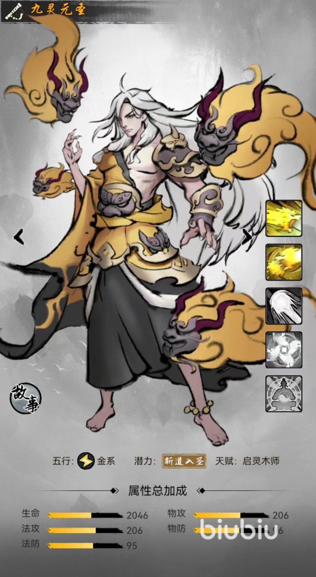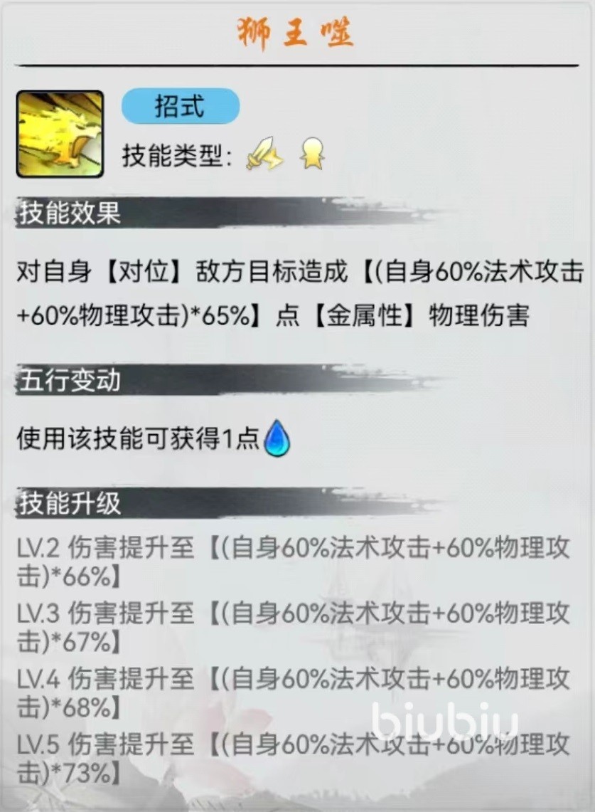 九灵元圣属于金系顶级仙友之一,和牛魔王、红孩儿、大鹏王、刑天等一起组成恶佛魔道仙友羁绊,能够提供生命、物攻、物防等多方面的加成,是当前阵容中最顶级的羁绊阵容之一。自身普攻招式狮王噬,能够对单体目标造成一次物理伤害,在计算的时候自身法术攻击和物理攻击都按百分比折算进去,属于非常特殊的伤害类型。