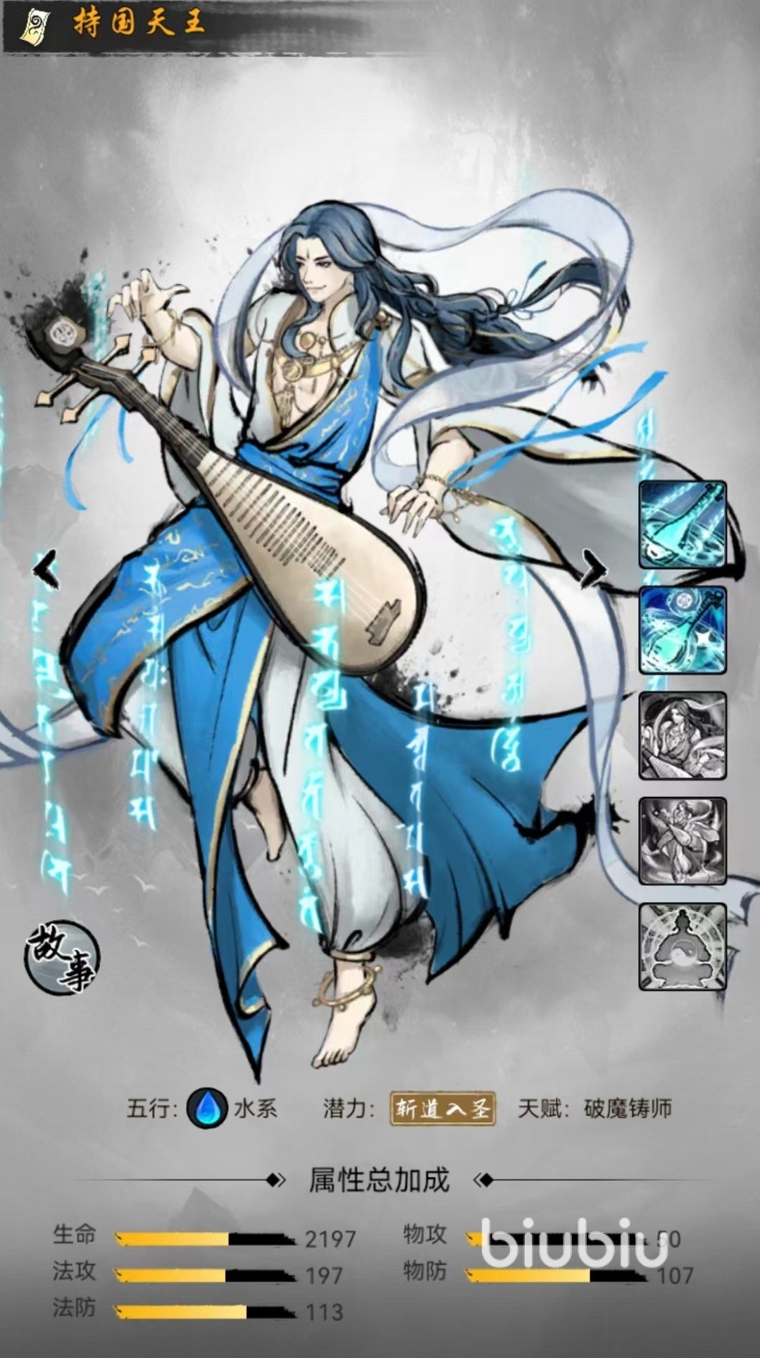 持国天王属于水系仙友,普通招式魔音,选定敌方血量最低的单个目标施加魔音效果,在效果持续的三个回合之内,如果被攻击则可以对目标造成一次法术伤害,触发后将移除魔音效果,属于延迟伤害类型。神通技能彻骨之音,锁定对方血量最低的目标施加彻骨魔音,同样属于延迟伤害类型,但是伤害数值要高很多,且本次伤害将无视对方部分法术防御。在心法加持下气劲和暴击属性提高。