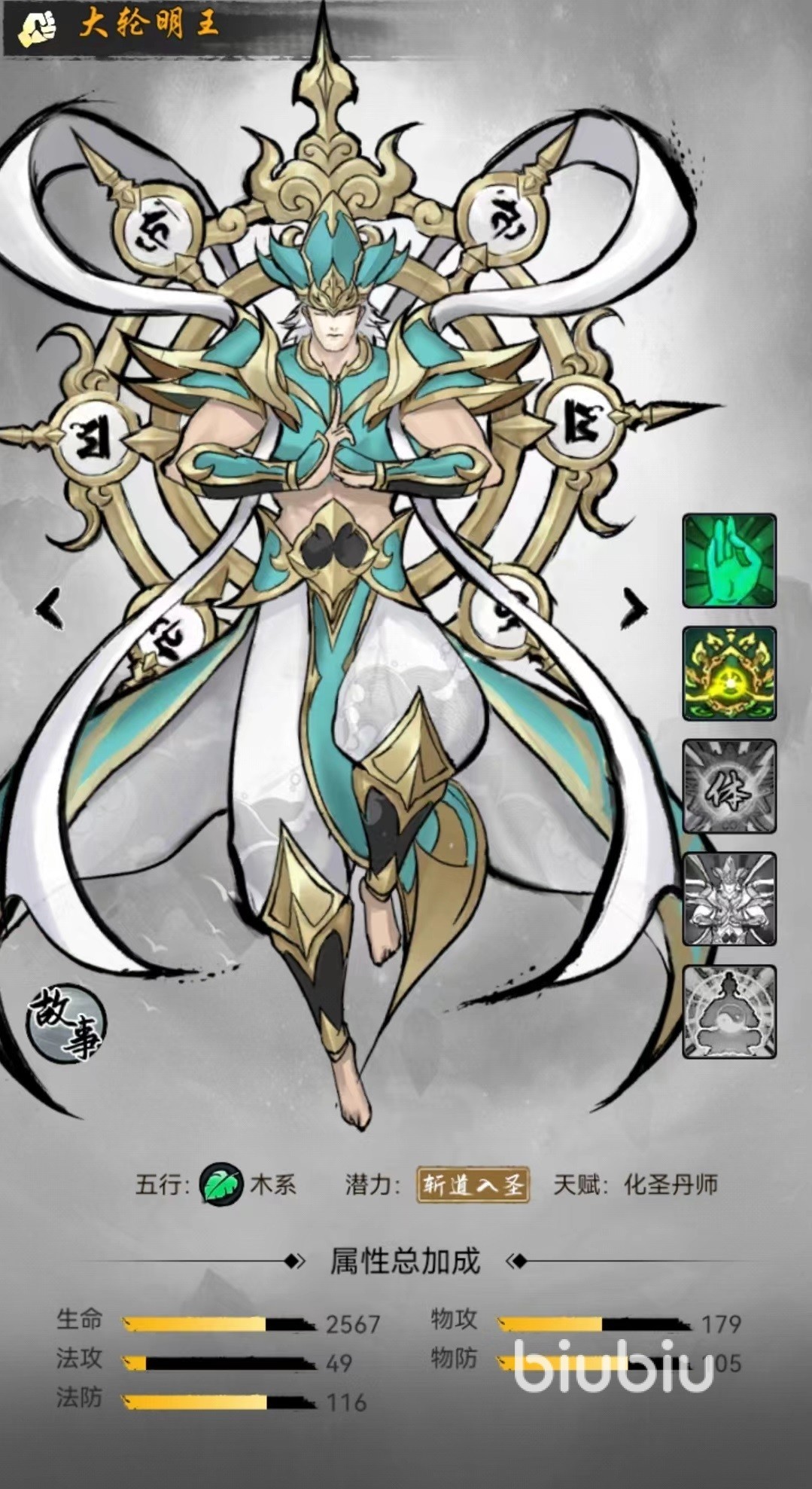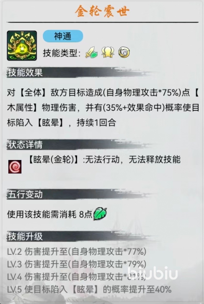 大轮明王属于木系仙友,招式不动禅,对敌方目标造成木属性法术伤害后,有一定几率使自身进入到减伤状态,在此状态下受到的伤害降低,持续两个回合。此效果能够为大轮明王带来很强的伤害承受能力,可以放到前排去吸收输出。神通技能金轮震世,伤害对方全体目标并且有极大几率使其陷入到眩晕状态,是一个既有肉又有控制的角色。