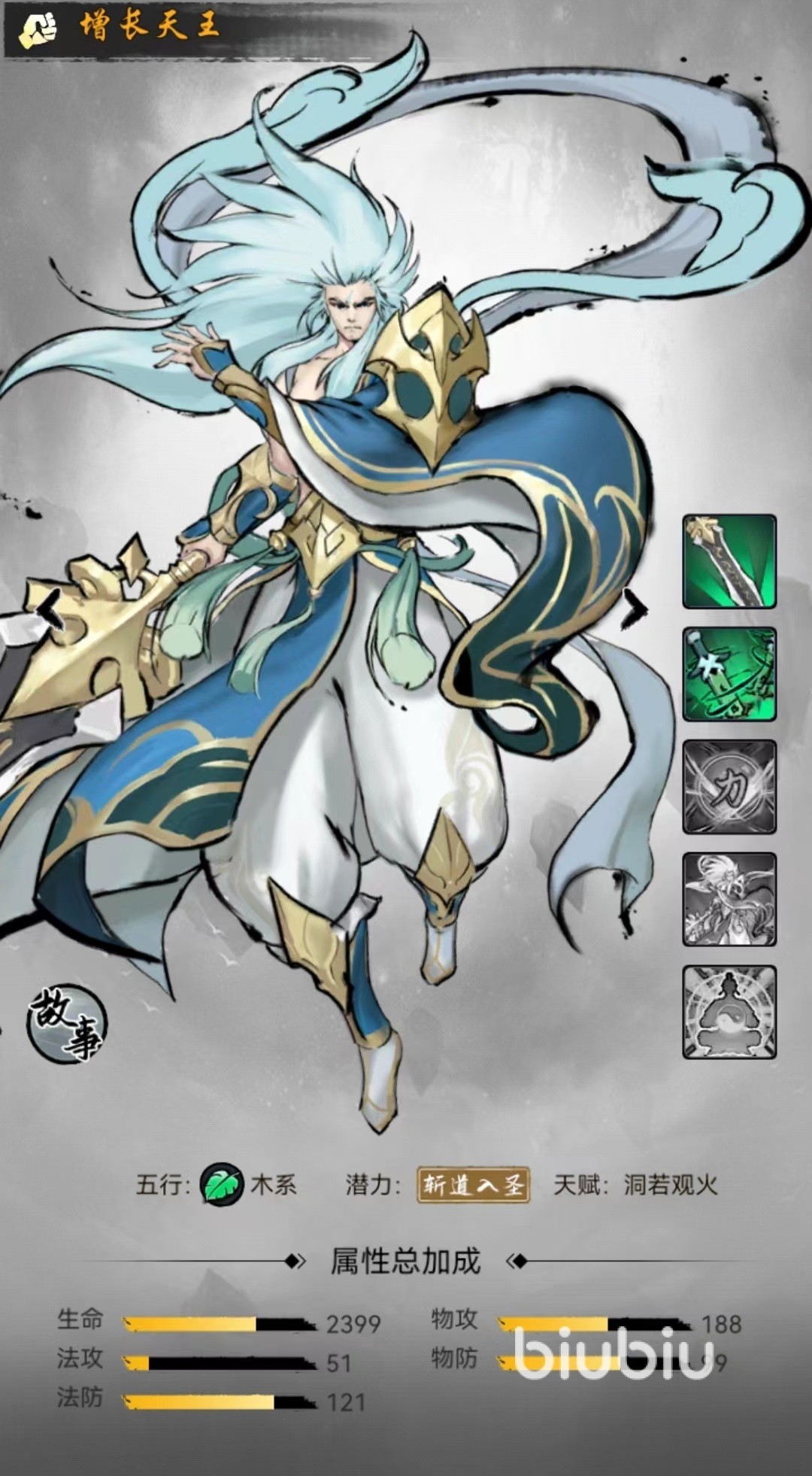 增长天王属于木系属性,普通招式慧剑青云,伤害对位敌方目标并有很大几率触发四法青云效果,额外造成一次物理伤害,技能升到满级时额外触发几率达到70%,已经是很可观的输出技能。神通招式清云罡风,伤害敌方全体目标同时有几率触发群伤版四法青云,额外造成群体物理伤害,升到顶级时同样触发概率为70%,是当前所有角色中输出能力顶尖的一个,四大天王上阵几率最大的一名。
