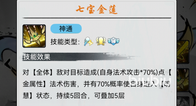 他的一技能为慧剑诀,属于一个攻击技能,可以对敌方对目标造成自身法术攻击伤害50%的金属性伤害,并且有35%的概率使自身进入明慧状态,可以提升15%的暴击效果,持续时间为五回合,最多可以叠加五层,也就是75%的暴击伤害。他的二技能为七宝金莲,同样是一个神通技能,可以对敌方全体目标造成范围性伤害,最高可以叠加70%的法术攻击伤害,并且有70%的概率使自身进入明慧状态提升,最大限度提升暴击率。