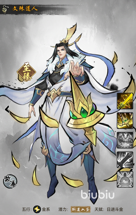 从定位上看,文殊道人就是一个非常强大的输出角色,他是元始天尊旗下的12金仙之一,是太乙真人以及姜子牙的师兄,无论是实力还是外观形象都是非常高大的,而且它还被称为智慧的象征,是很多玩家梦寐以求的角色,很值得培养。一共会拥有五个技能,其中前两个为主动技能,是可以是进行释放的,剩下的三个技能属于被动技能,当该角色达到一定的品质之后可以自动解锁,能够全方位的提升文殊道人的属性。