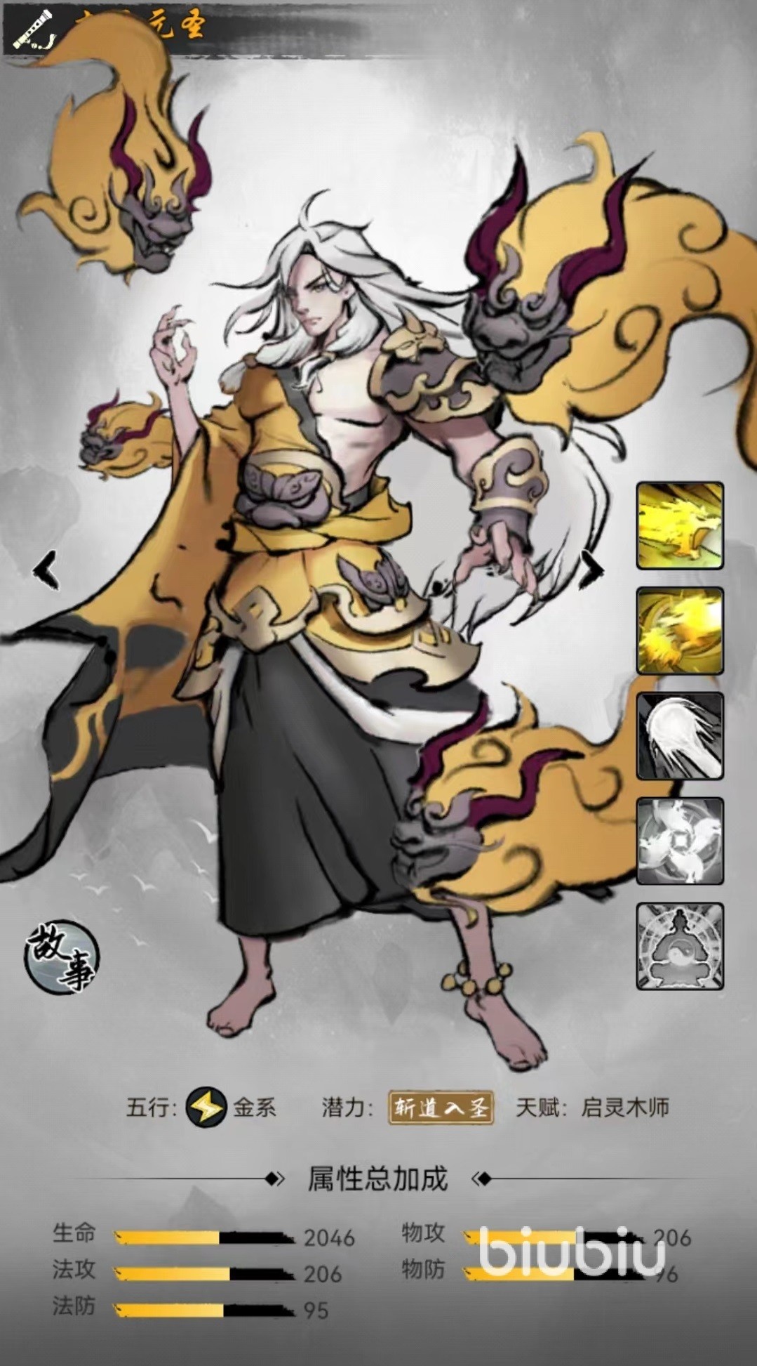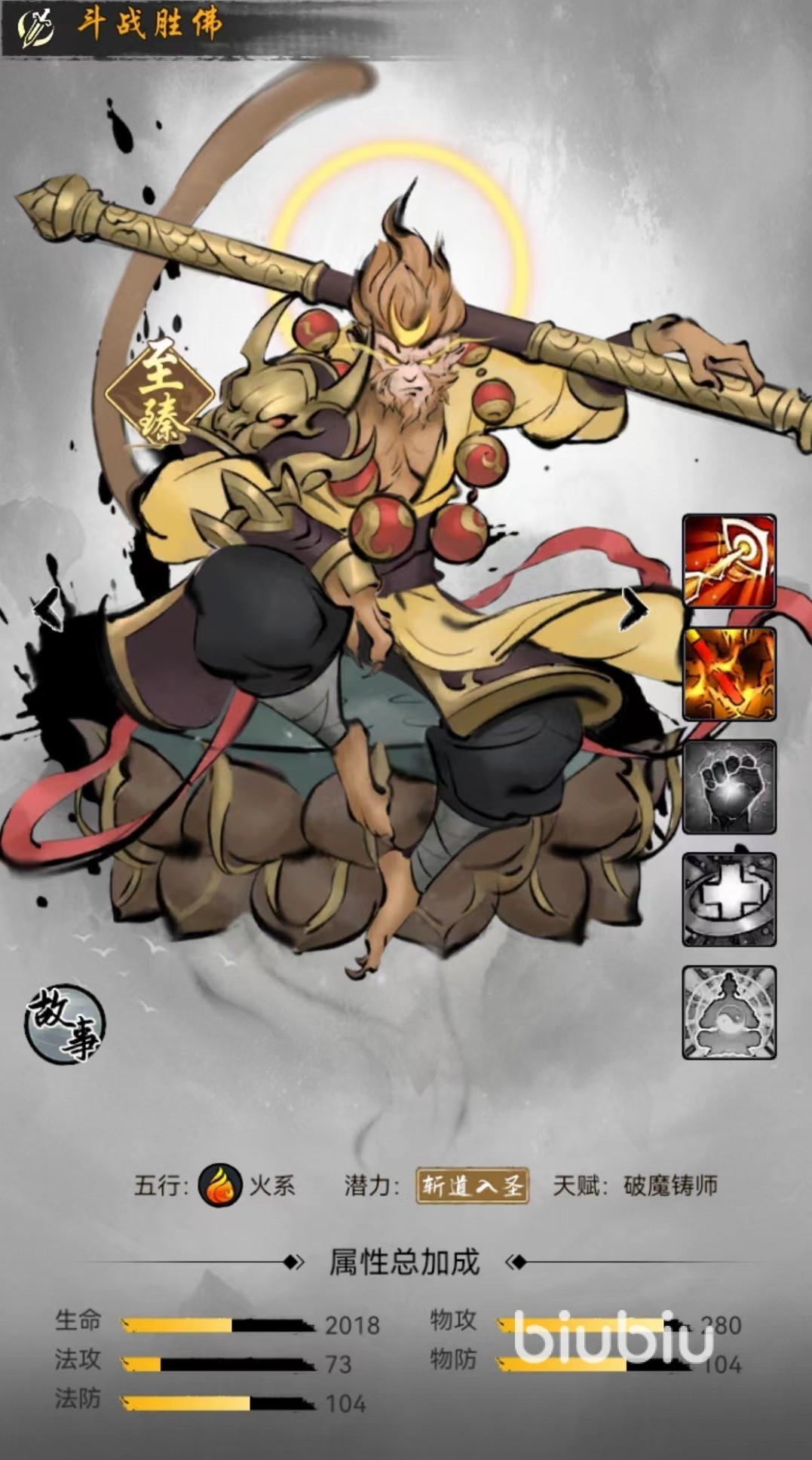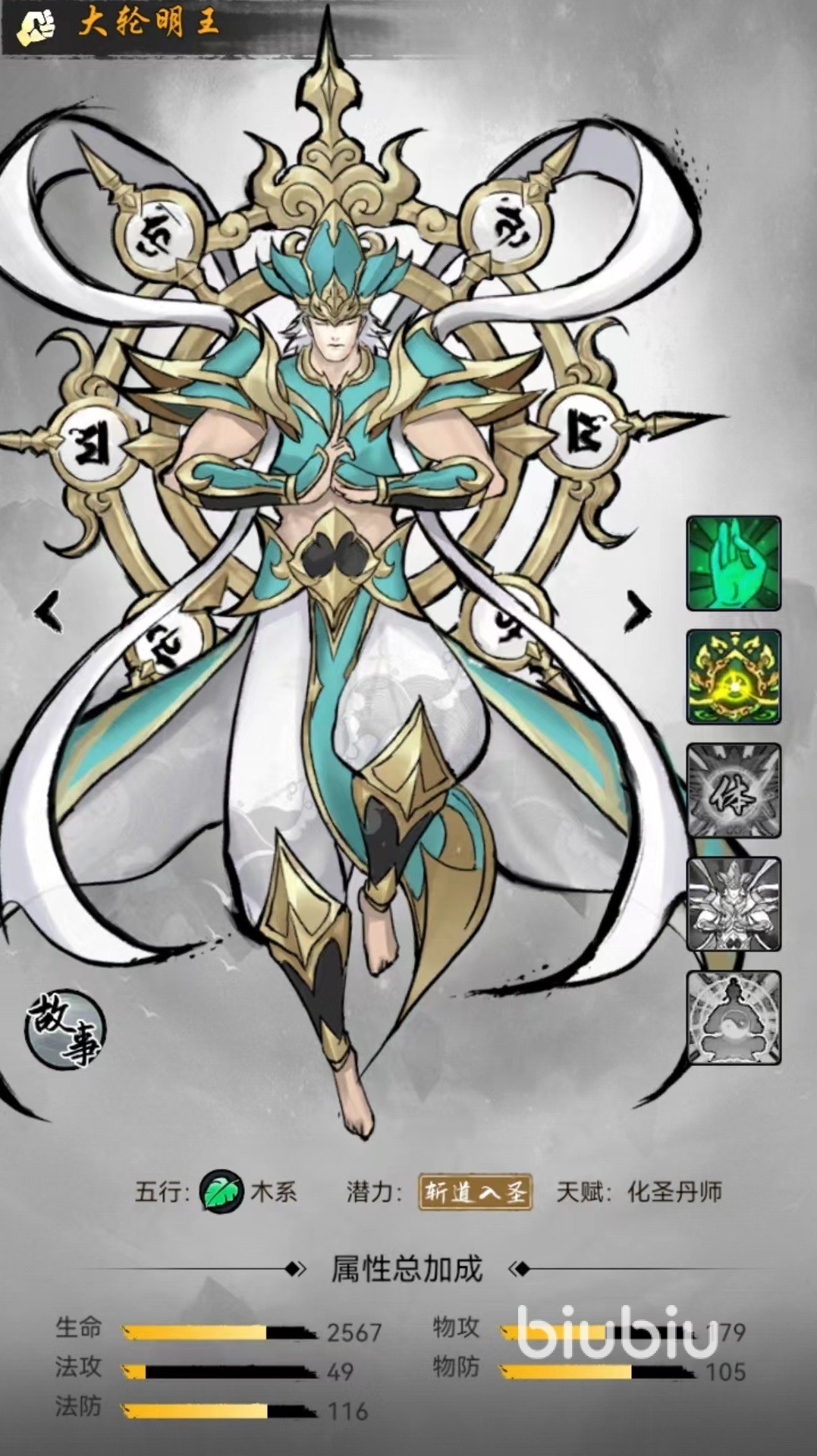 所以小编接下来在五行之中各选择一个最佳推荐给大家,金系选择的是九灵元圣,木系选择大轮明王,水系选择天蓬元帅,火系选择斗战胜佛,土系选择赵公明。九灵元圣招式狮王噬,伤害对位敌方目标,在计算伤害时自身法术攻击和物理攻击一起提供加成。神通技能九口连式,伤害对方全体目标,并且有概率再追加一次伤害,运气好了连续两个神通可以给敌方带来极大的输出。在心法加持下,自身暴击提升并且获得追击效果。