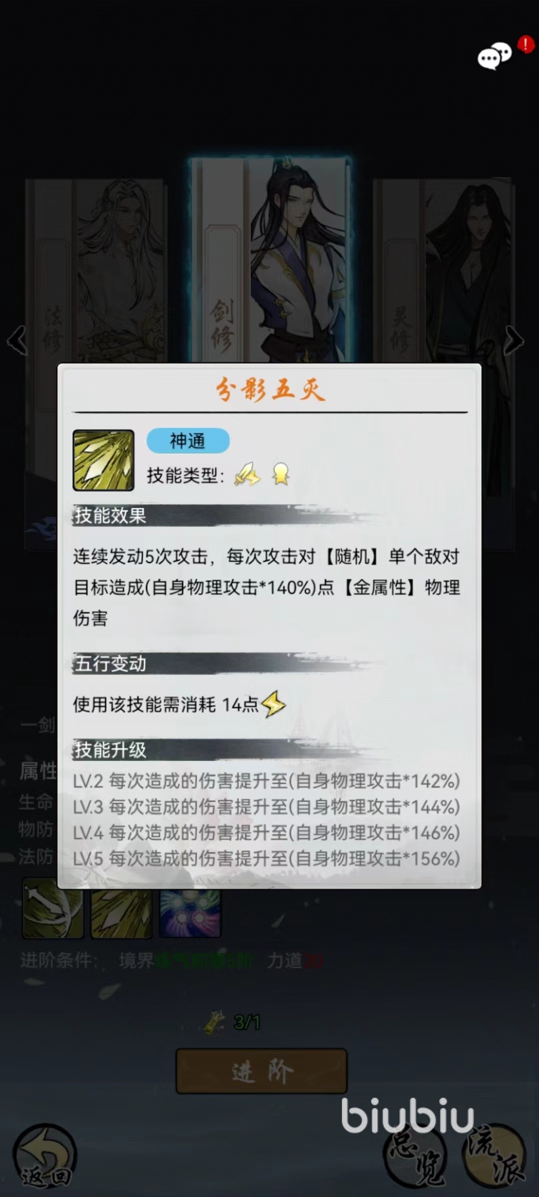 剑修初始招式戮心,伤害单个目标进行多次攻击,使用后获得能量。神通技能飞影五灭,连续发动5次攻击,每一次伤害目标随机选择使用,需要消耗14点能量。能量太多是剑修最大缺陷,不利于前期发挥,需要一定的空间才能打出大招,但是大招伤害确实很高,这也是很难两全的事情。剑修进化到极致分别是幽城剑魔,一心剑,鸿蒙剑仙和不朽剑。