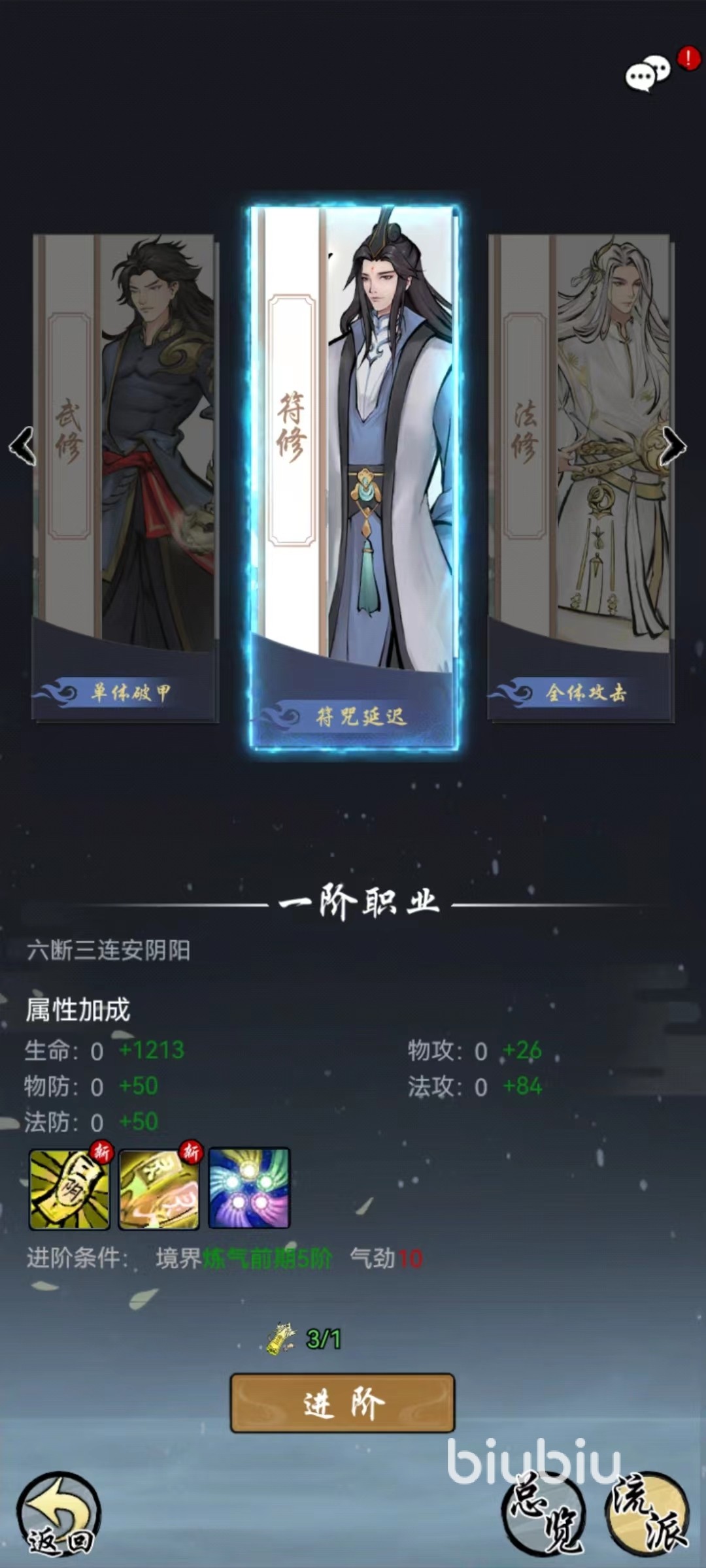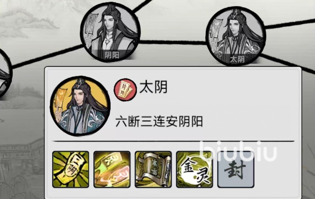 在第1阶段,符修招式对敌方单体造成法术攻击,使用户获得能量神通技能为敌方目标贴上符咒,在存在的回合内,只要被攻击就能直接对敌方造成一次伤害。往后可以进化的路线分别为曜日和太阴,曜日招式效果替换为为友方目标进行治疗,神通技能为全体恢复血量,相当于直接切换到了纯辅助状态。太阴则不同,自身获得心法提高气劲,向输出方面发展。