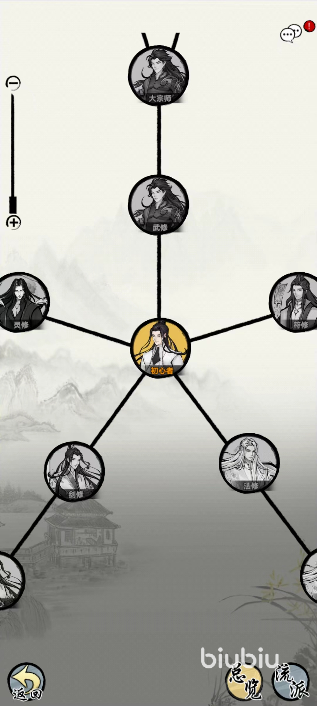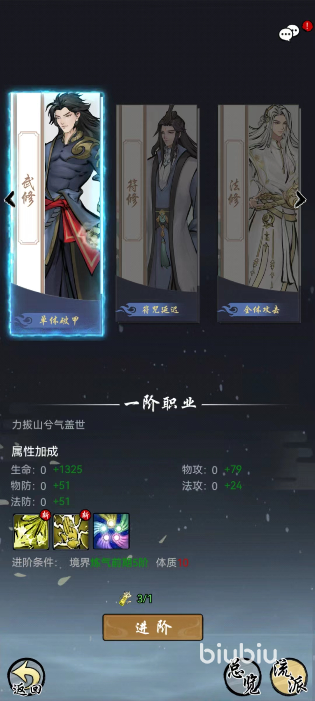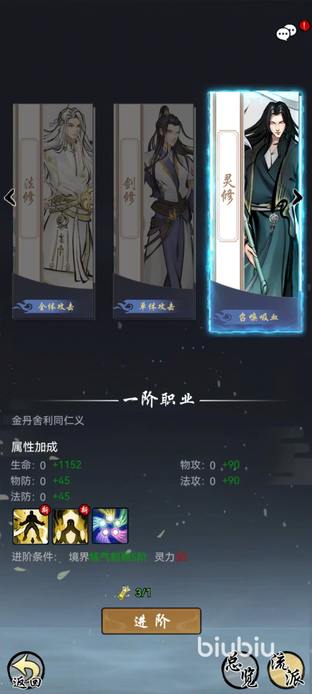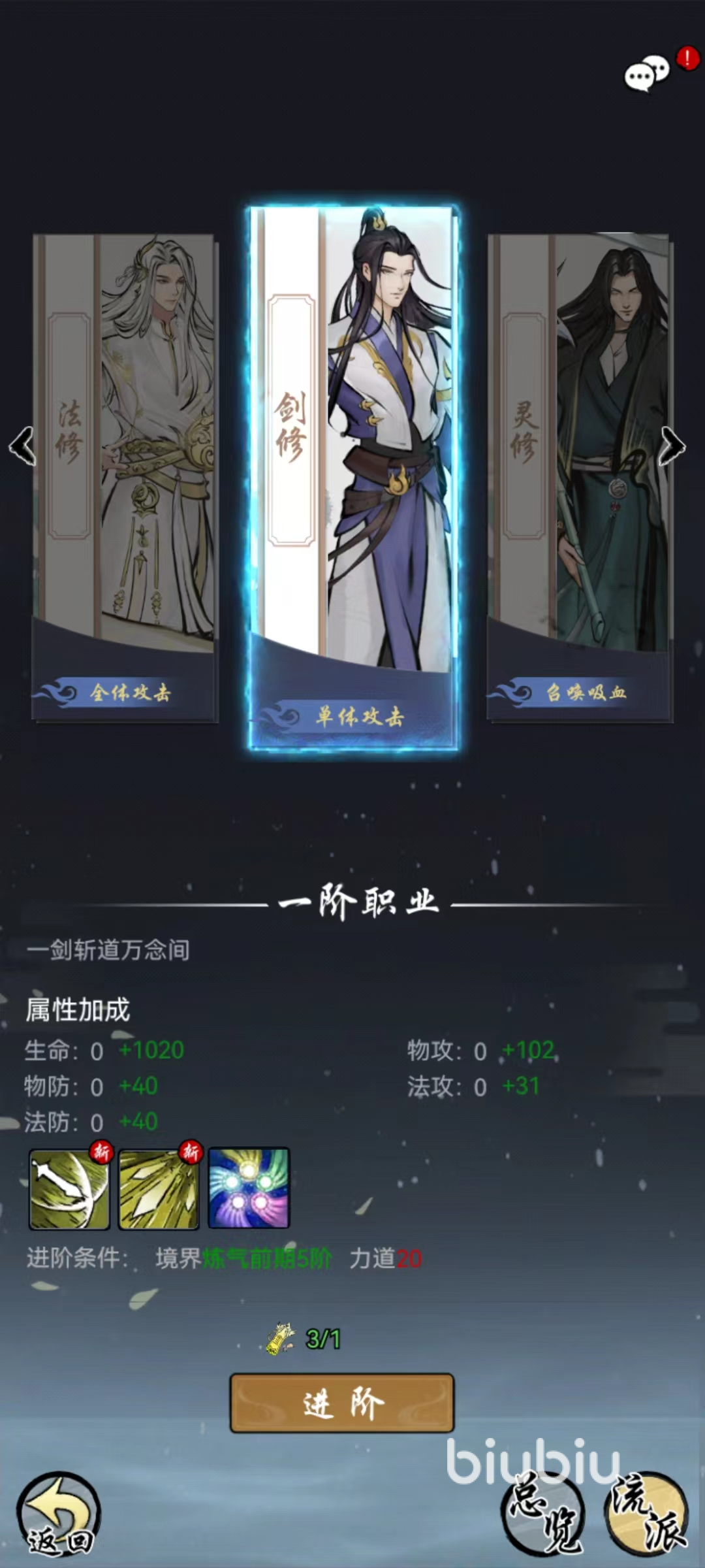 等到度过游戏初期的引导阶段之后,就可以在禁地里找到掌门师尊,然后进行修行门派选择,初期选择的是一阶职业,后期还可以进行各种晋升。目前提供的有武修、符修,法修,剑修,灵修这5种,每一种都对应有自己独特属性和技能,接下来小编简单介绍一下各自特点。